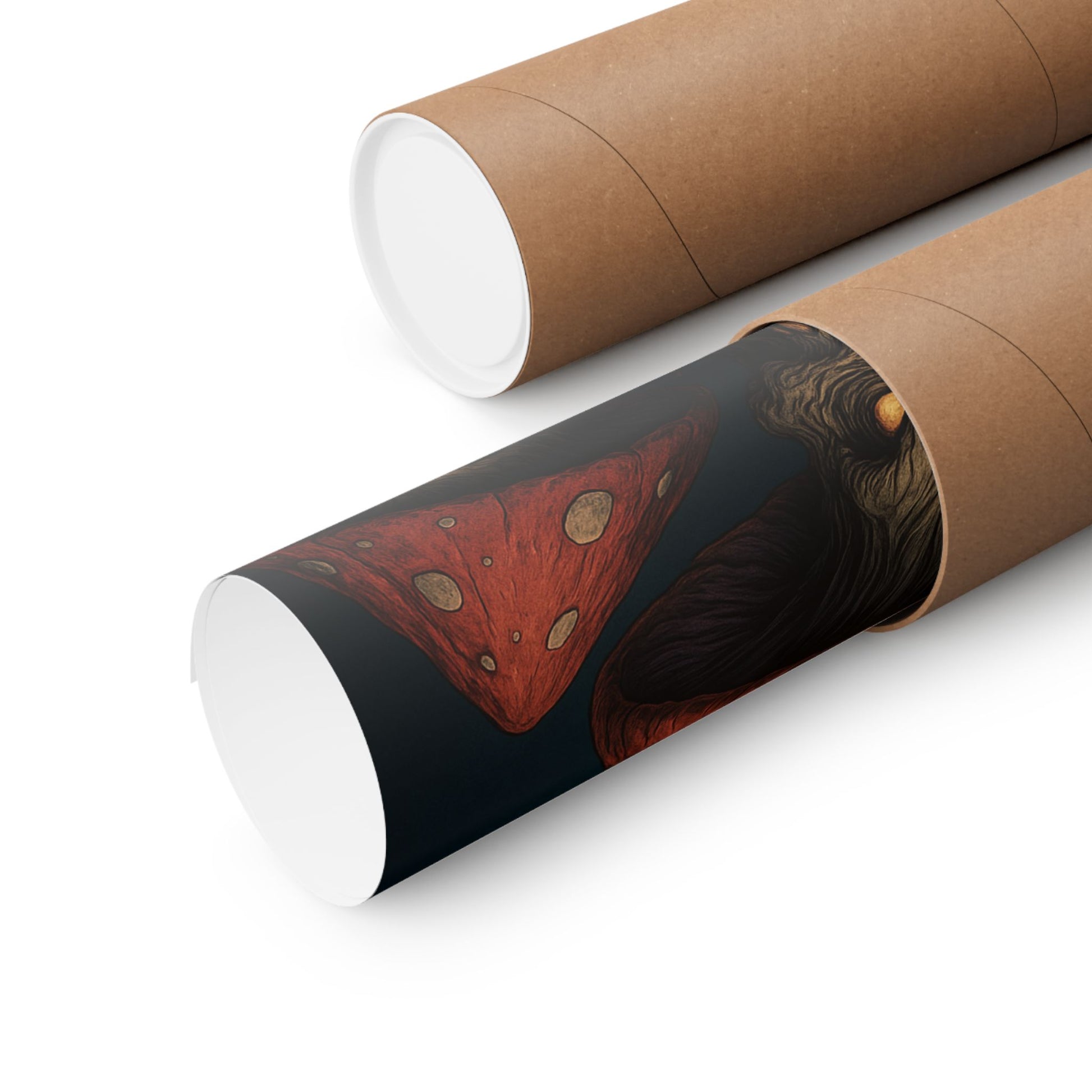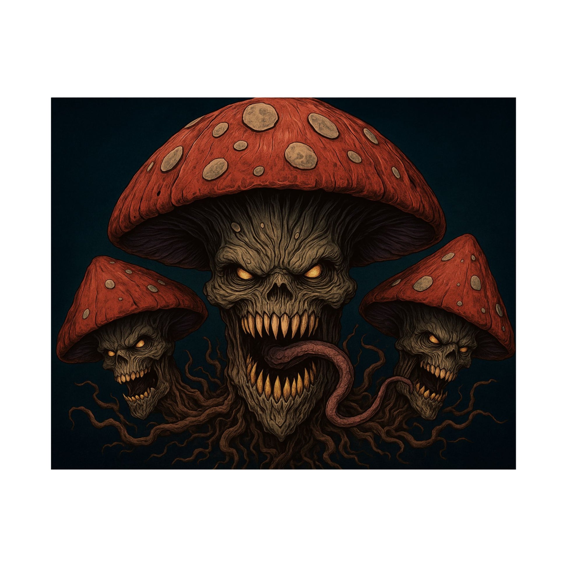 Enter the nightmare forest where mushrooms bite back. This dark fantasy poster features three monstrous fungi with snarling faces, twisted roots, and glowing eyes that pierce the shadows. With blood-red caps and razor-sharp teeth, these creatures aren’t here to blend in — they dominate the scene with raw, surreal menace. The artwork is rich in detail and texture, perfect for those who crave horror with a psychedelic twist. Whether you're into dark art, twisted humor, or eerie mushroom mythology, this piece demands attention and sparks conversation. A wild fusion of fear and fungi, straight from the depths of imagination.