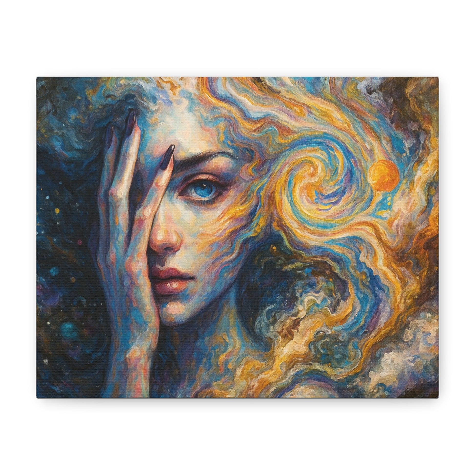 A hypnotic portrait where the cosmos flows through every strand — her eye meets yours, while the other hides behind a hand, like a guardian of unspoken truths. Swirling nebulae and vibrant strokes merge into a psychedelic storm of color, pulling you into a deeper state of wonder. This canvas is more than art — it’s a portal into the surreal.