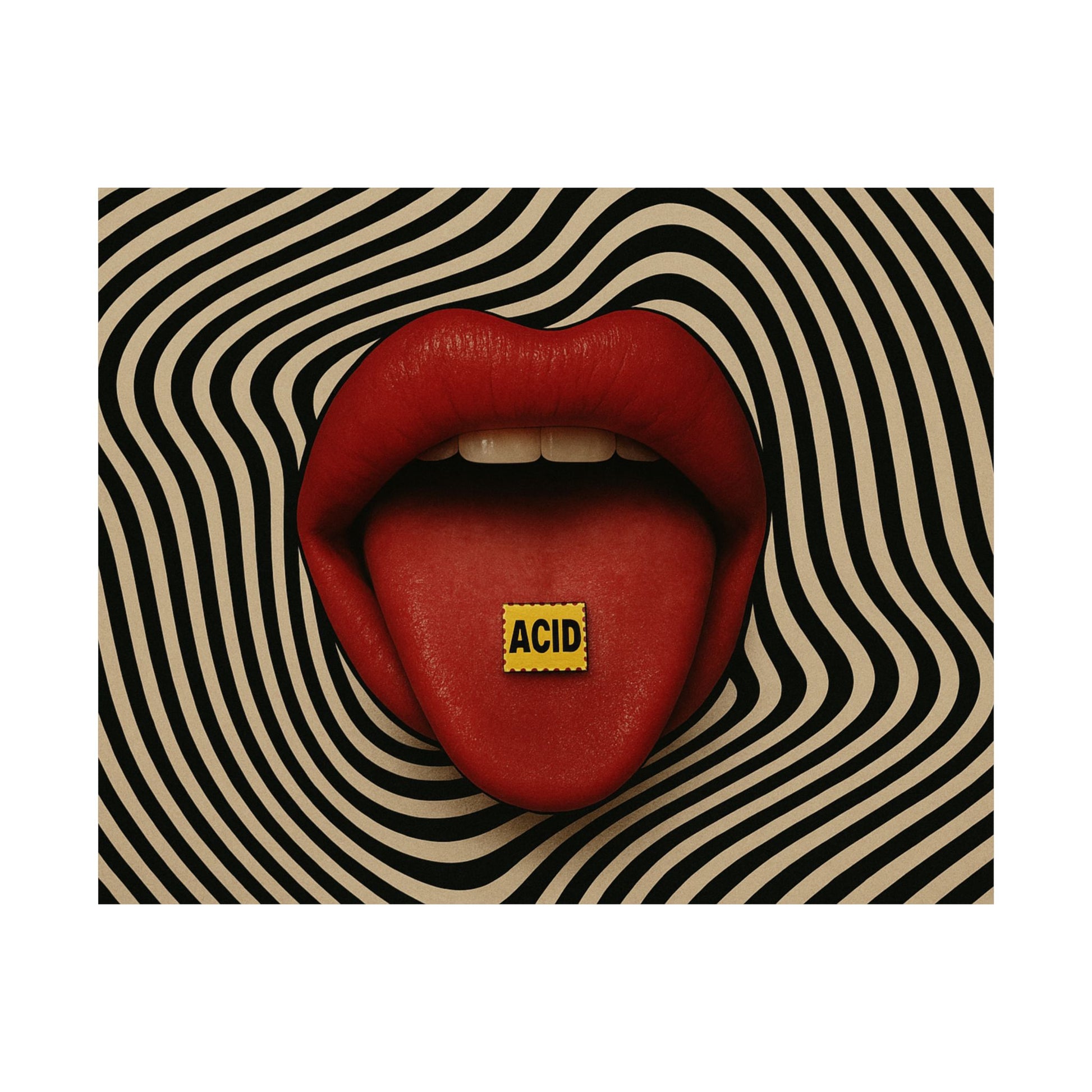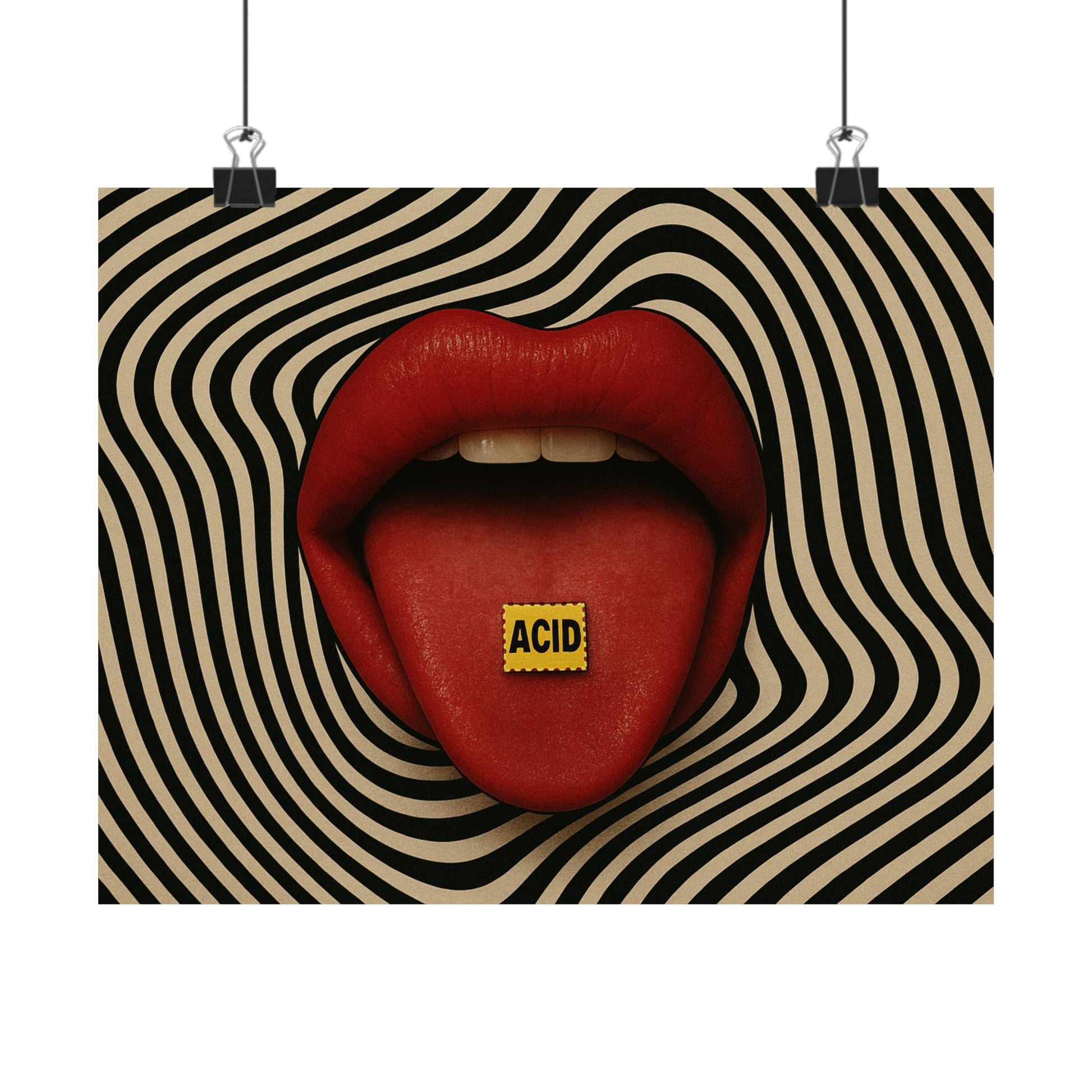 Dare to stand out with this trippy, high-impact poster featuring bold red lips and a vivid LSD tab on the tongue, set against a hypnotic black-and-beige wavy background. A striking fusion of pop art and surreal psychedelia, this artwork commands attention and adds bold energy to any space. Ideal for modern interiors, music studios, and anyone drawn to counterculture aesthetics.